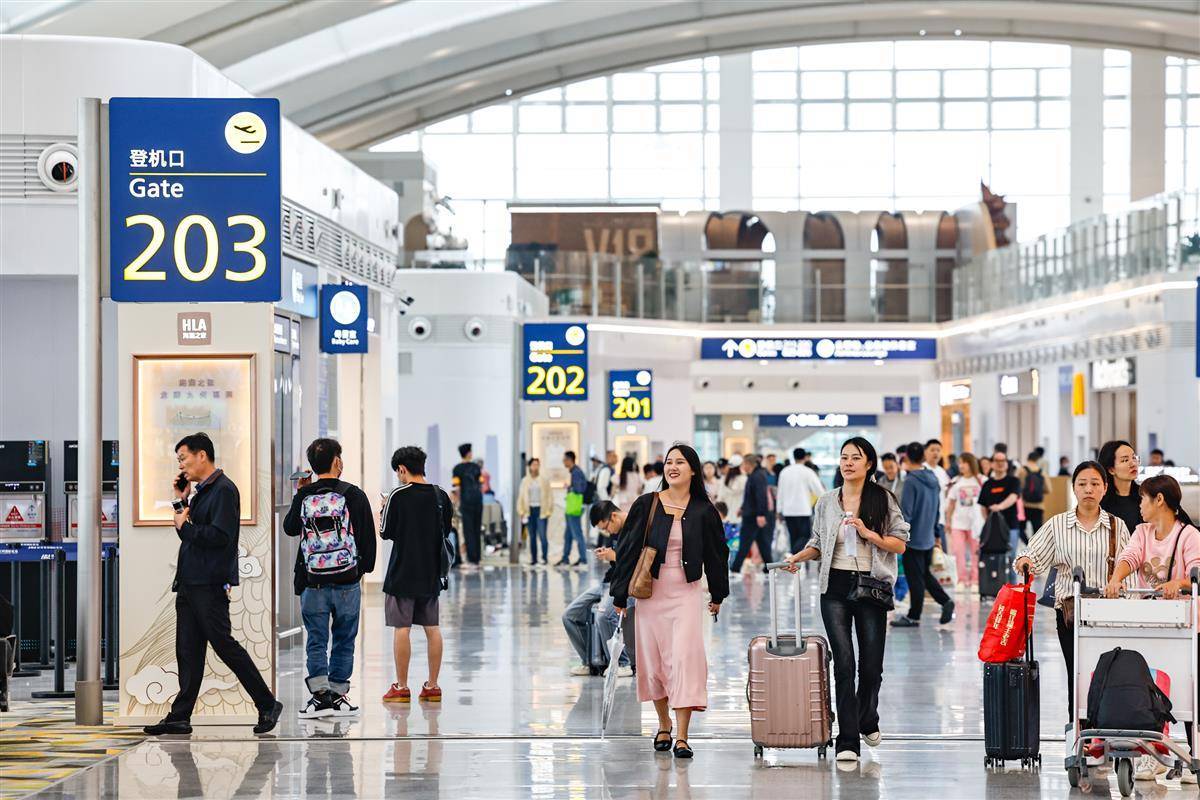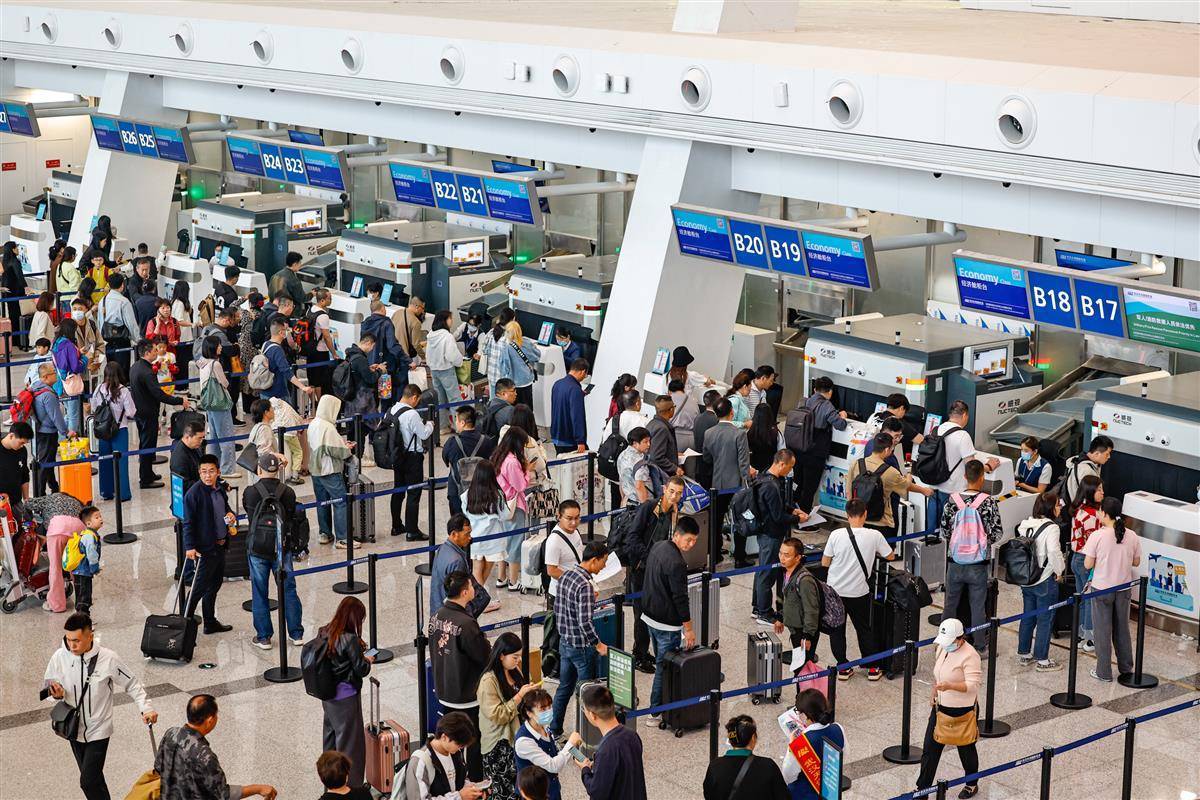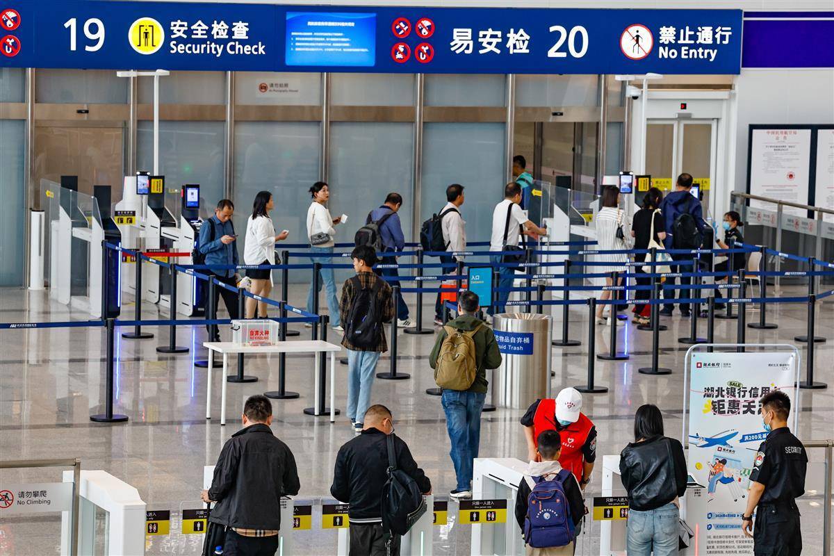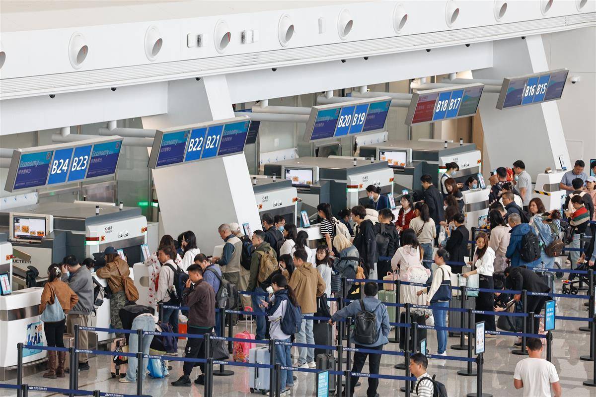 4月30日,在武汉天河机场航站楼内,旅客们正在机场办理出发手续。当日,武汉天河机场预计运输旅客8.9万人次。据了解,今年五一小长假,武汉天河机场预测运输起降航班3200架次,预测发送旅客44万人次,同比去年同期分别增长7%、20.9%。(湖北日报全媒记者 倪娜 通讯员 杨永勇 习悦 摄)