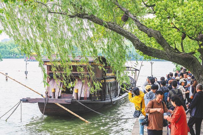 4月26日,南湖中共一大红船停泊处游人如织。