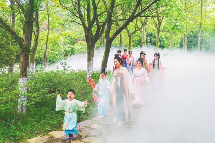 4月27日,刚刚改造完成的嘉兴植物园仙气飘飘,一群身着汉服的游客在绿林间穿行,好似一幅赏春图。