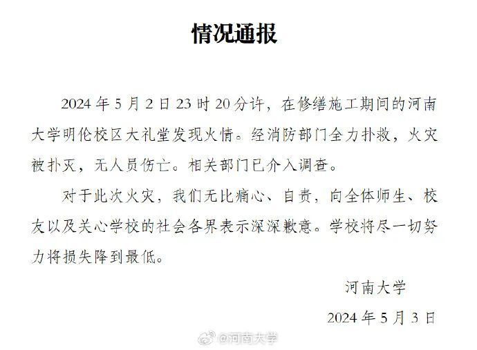 5月3日,河南大学发布情况通报,5月2日23时20分许,在修缮施工期间的河南大学明伦校区大礼堂发现火情。经消防部门全力扑救,火灾被扑灭,无人员伤亡。相关部门已介入调查。