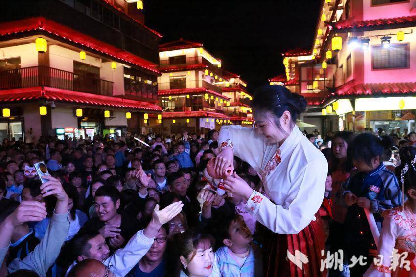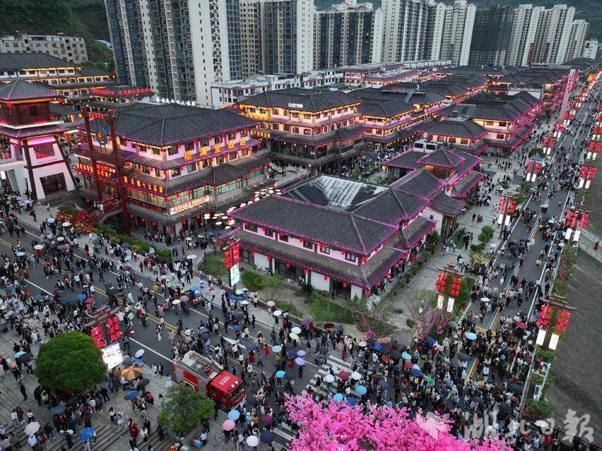 5月1日,竹山县城关镇桃花源街区正式开街,207家商铺开门迎客。当天该街区内游人如织,车水马龙,商圈人头攒动,景区开启了“人从众”模式。绚丽的音乐喷泉,璀璨夺目的广场光影,沉浸式的商业夜游景观,超震撼的无人机表演……不一样的游玩方式和地点,透着一样的热闹和烟火气,浓郁且旺盛。虽然因为游客扎堆,路上有时难免拥堵,景区和餐馆难免排队,但久违的热闹场景,透着喜气洋洋,让人倍感亲切。五一假期前两天,桃花源街区每天吸引全国各地超10万人次前来打卡。