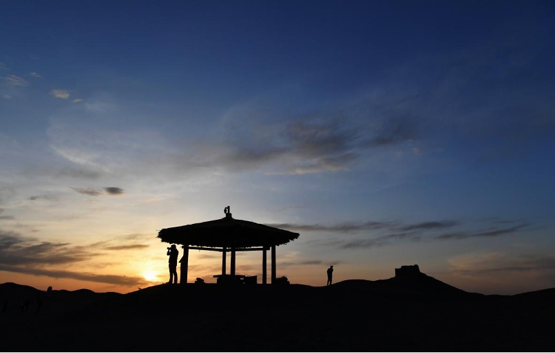 傍晚,游客在阳关拍摄大漠落日景色。新华社记者 陈斌 摄