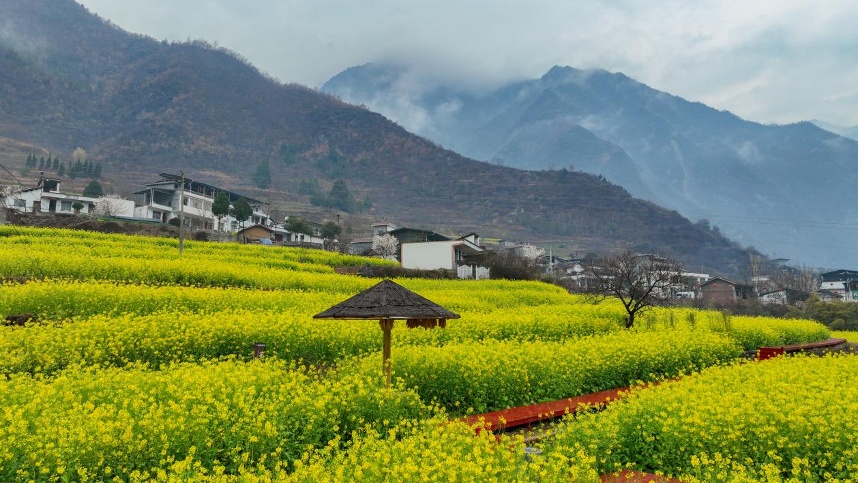 陇南市文县玉垒乡的油菜花海(无人机照片)。新华社记者 郎兵兵 摄