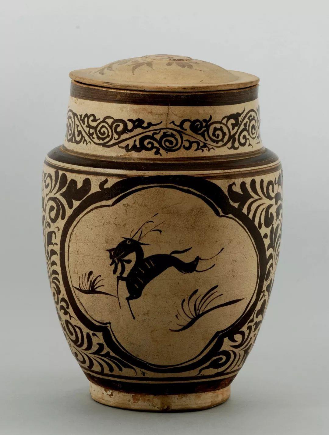 △釉下彩绘跃鹿纹罐(颈部为蔓草纹)(多说一句:这个审美,简直“小鹿乱撞”)
