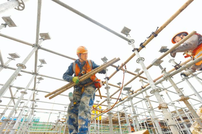 5月1日,武汉新能源与智能网联汽车创新产业园(一期)项目现场,工人们正在加紧安装脚手架。(湖北日报全媒记者 柯皓 通讯员 罗玉箫 石梦云 摄)