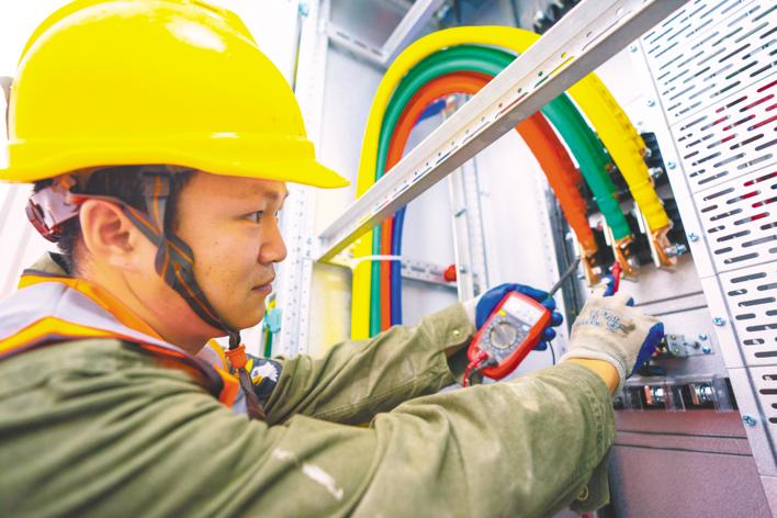 5月1日,中建三局佛祖岭地铁站物业项目施工现场,电工蹲在低压柜背后狭小的空间里,检测电缆接头。 (湖北日报全媒记者 魏铼 通讯员 谌小雅 胡甘霖 摄)