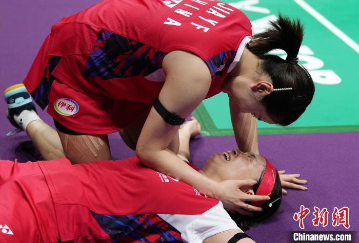 4日,中国队在成都2024尤伯杯半决赛中以大比分3:0战胜日本队,队史第20次打入尤伯杯决赛。图为中国女双组合陈清晨(下)、贾一凡(上)在赛后庆祝。她们以2:1逆转战胜日本组合松山奈未/志田千阳,为中国队赢得关键一分。中新社记者 安源 摄