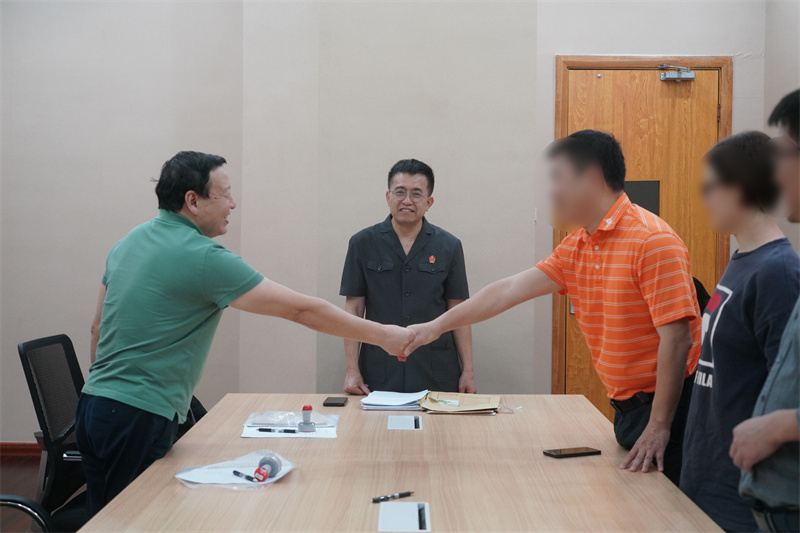 3月27日,在北海中院执行法官的主持下,北海星石碳材料科技有限公司(左)与债权人(右)握手言和,债权人撤回执行申请。