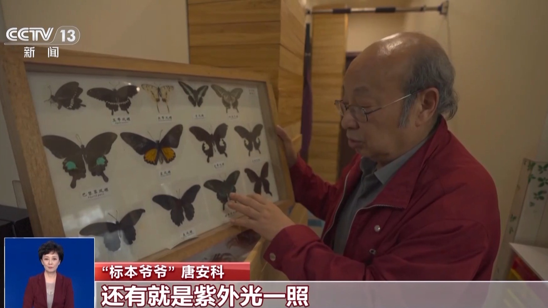 “标本爷爷” 唐安科:有些蝴蝶搁久了过后颜色都淡了,还有就是紫外光一照,那个颜色就掉了,所以像那些蝴蝶的话,我就加点黑色的粉,它能够保存的时间要长一些。