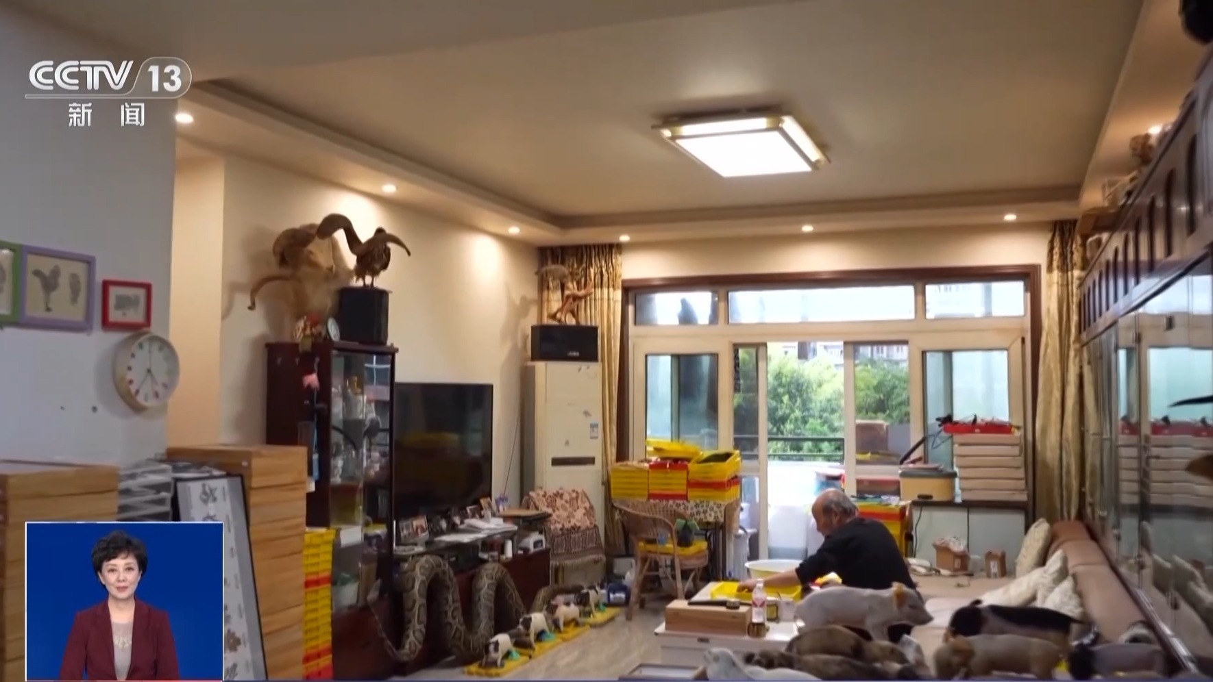 若非亲眼所见,真的很难想象相信,这家的客厅里竟然有一只不会动的鹰隼在环顾四周,在几摞叠得齐人高的标本框上,还有几只“栩栩如生”的白色花枝鼠,冰箱顶上“挺拔站立”着几只野鸡,电视柜旁有几只刺猬,茶几上是一只小家猪,阳台上还有只小狗,书柜里还摆着一条玉米蛇……