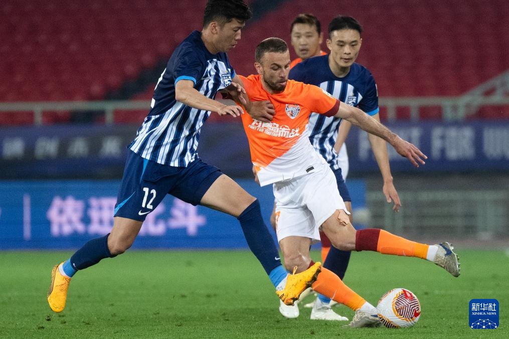5月5日,青岛海牛队球员萨里奇(右前)在比赛中与武汉三镇队球员张晓彬(左)拼抢。新华社记者 肖艺九 摄