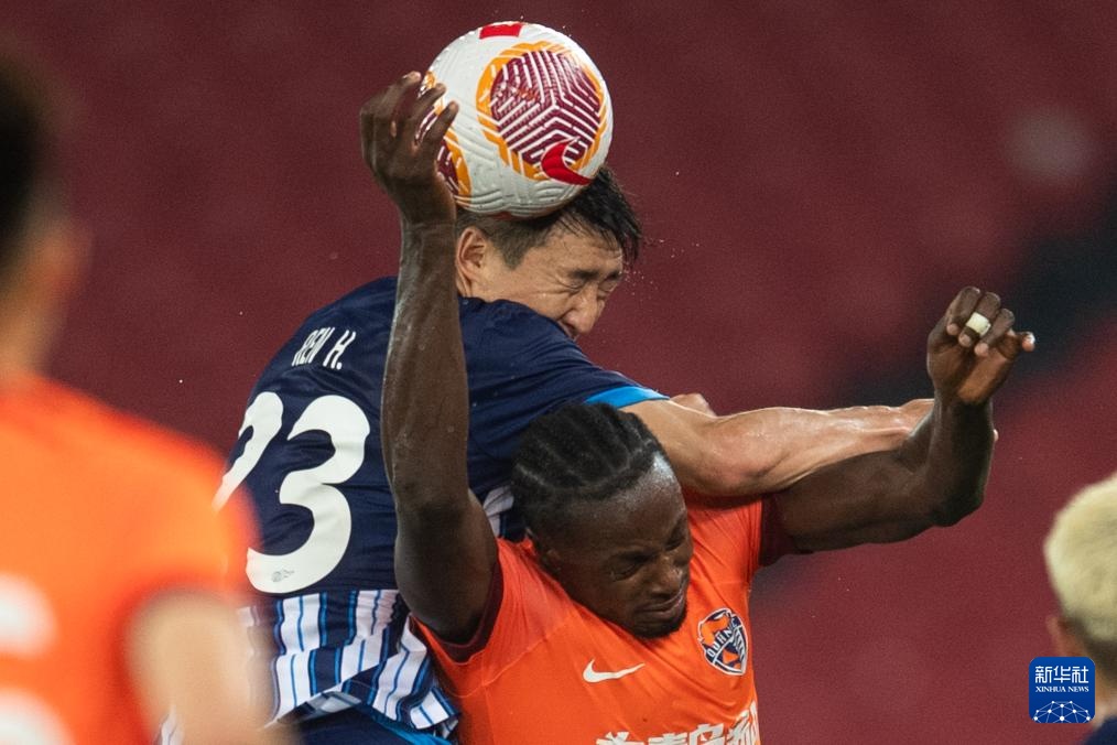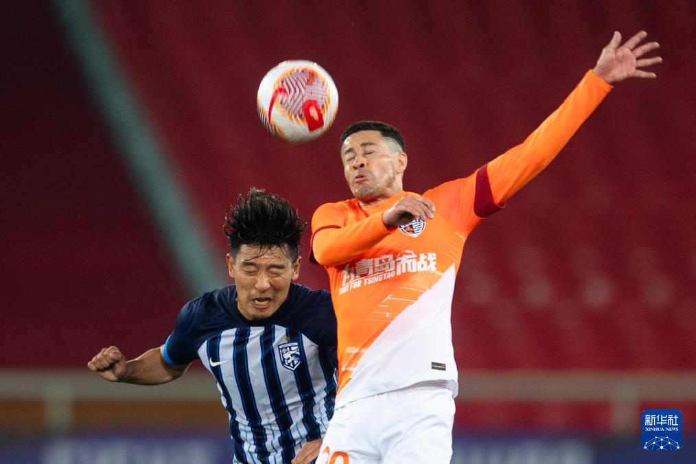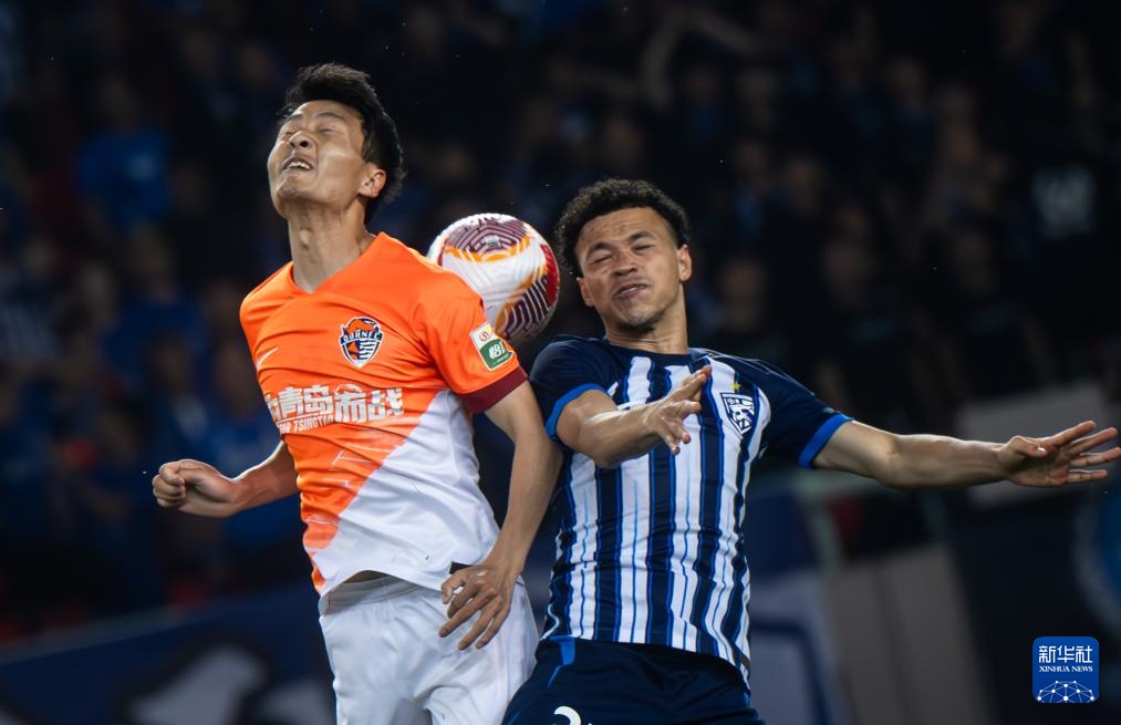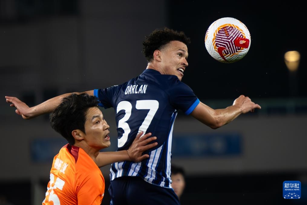 5月5日,武汉三镇队球员达兰(右)在比赛中与青岛海牛队球员龙威争顶。新华社记者 肖艺九 摄
