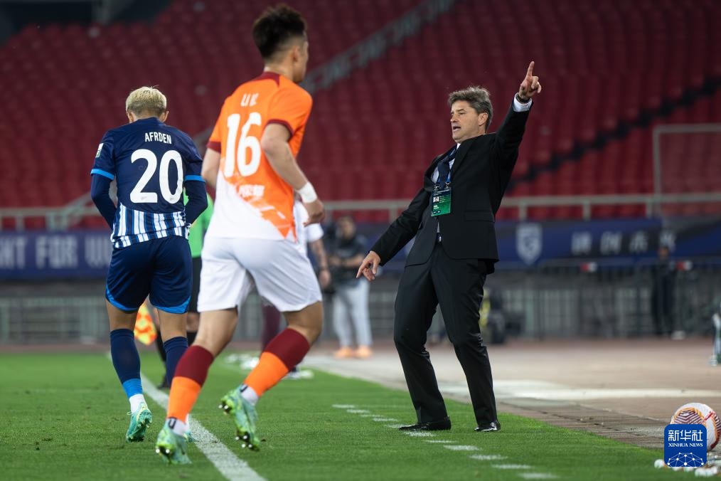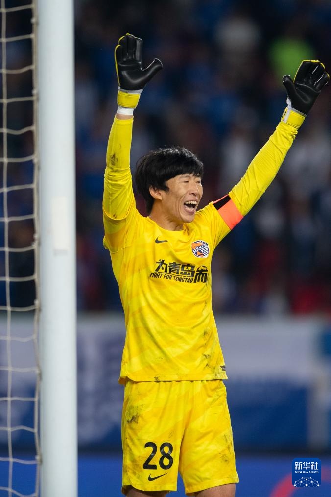 5月5日,青岛海牛队守门员牟鹏飞在比赛中指挥队友。新华社记者 肖艺九 摄