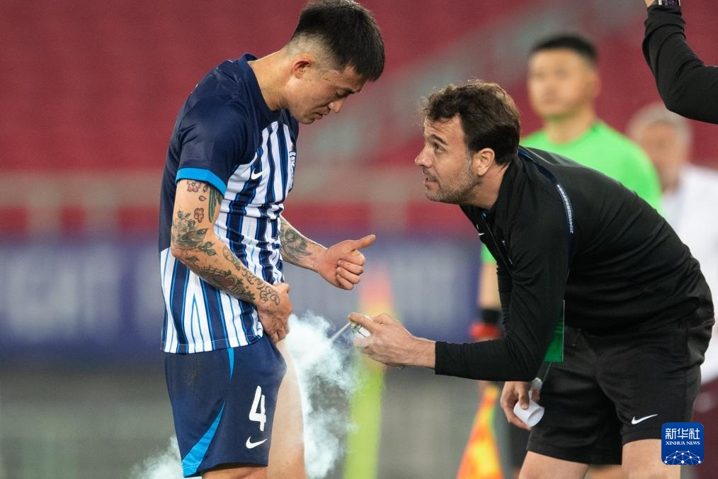 5月5日,武汉三镇队球员姜至鹏(左)与主教练里卡多在场边交流。新华社记者 肖艺九 摄
