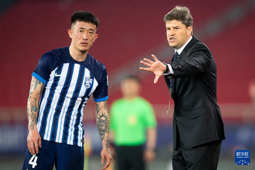 5月5日,武汉三镇队主教练里卡多(右)在场边指挥。新华社记者 肖艺九 摄