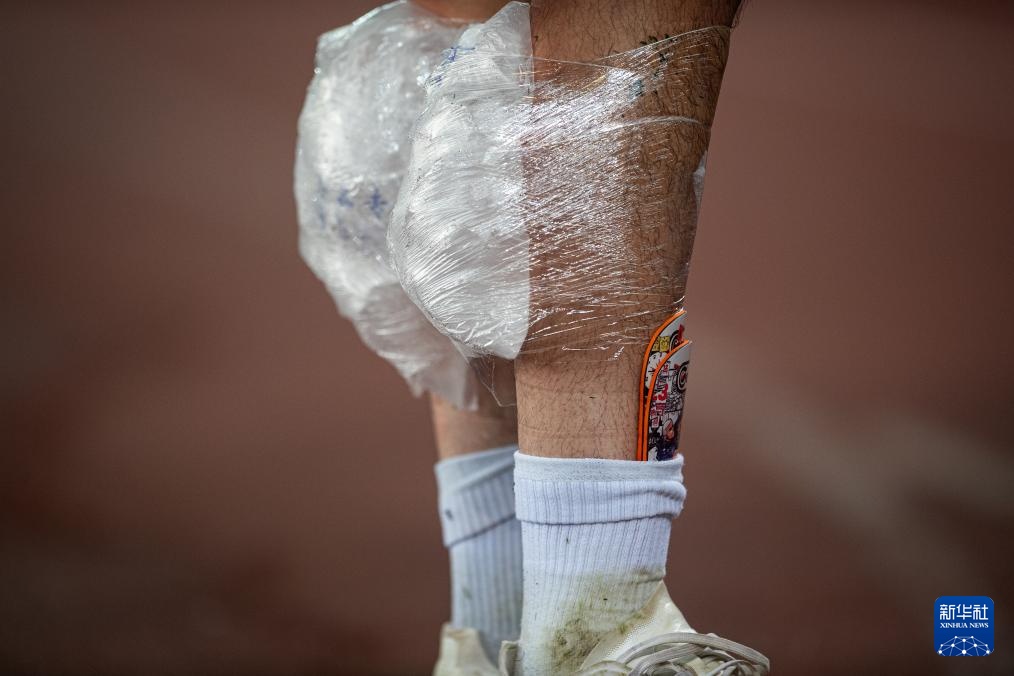 5月5日,武汉三镇队球员刘若钒的小腿接受冰敷治疗。新华社记者 肖艺九 摄