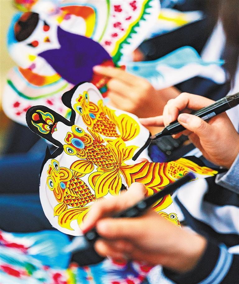 4月29日,北京市西城区学生在为风筝图案配色。北京风筝以燕子为主要造型,具有拟人化的特点,内容则多以民间喜闻乐见的吉祥图案来呈现。