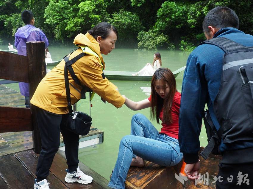 “我们的工作包括水上救援、收发救生圈、维持游客秩序等。如果游客溺水或滑倒,我们会第一时间进行救援。像这几天一直下雨,我们要提醒在岸边拍照的游客注意安全。”李红是鹤峰冬泳协会的会员之一,在这个假日期间,她每天早上七点半就会穿戴好志愿服装、佩戴好写有“鹤峰冬泳”的救生圈,前往自己负责的区域开始工作。搀扶拍照打卡的游客上下船、回答游客疑问、疏散人群,她穿梭于人群当中,提醒游客注意安全、小心脚下。在景区内,李红等志愿者的服务也得到了游客们的一致好评。