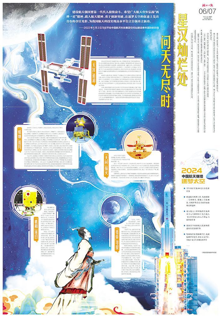 湖北日报2024年4月25日06/07版《星汉灿烂处 问天无尽时》,以蓝色为底色,以屈原“问天”为意象,以“天宫”遨游、“嫦娥”揽月、“天问”探火、“羲和”逐日、“觅音”寻星为小标题,版式有创意,精致醒目,抓人眼球。屈原《天问》引领全文,既富有诗意,又具有历史的纵深感。黄色的标题如繁星点缀在深蓝的天幕上,很有意境。探索浩瀚宇宙,发展航天事业。追梦星辰大海,建设航天强国。荆楚大地,列星闪耀,极目楚天,共襄星汉。