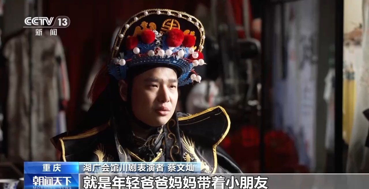 湖广会馆川剧表演者 蔡文灿:脸上基本就是八层,夏天变完一场,脸谱全部会被汗水打湿完。你自己做了,就要把这个工作做好,也是对传统文化的传承保护。现在更多的是年轻人,就是年轻爸爸妈妈带着小朋友,他们也想看一下传统的非遗是怎么样的,下面太热情了,要拉着我合照、握手。