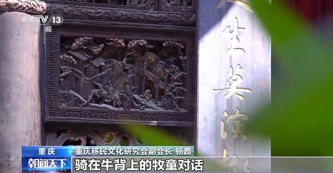 重庆移民文化研究会副会长 杨路:这一组深浮雕被专家誉为我们会馆的镇馆之宝,带有透视绘画技法的。一位官人在和骑在牛背上的牧童对话,牧童的手指着那道门,门上面仔细看有杏花村三个字。“清明时节雨纷纷,牧童遥指杏花村。”