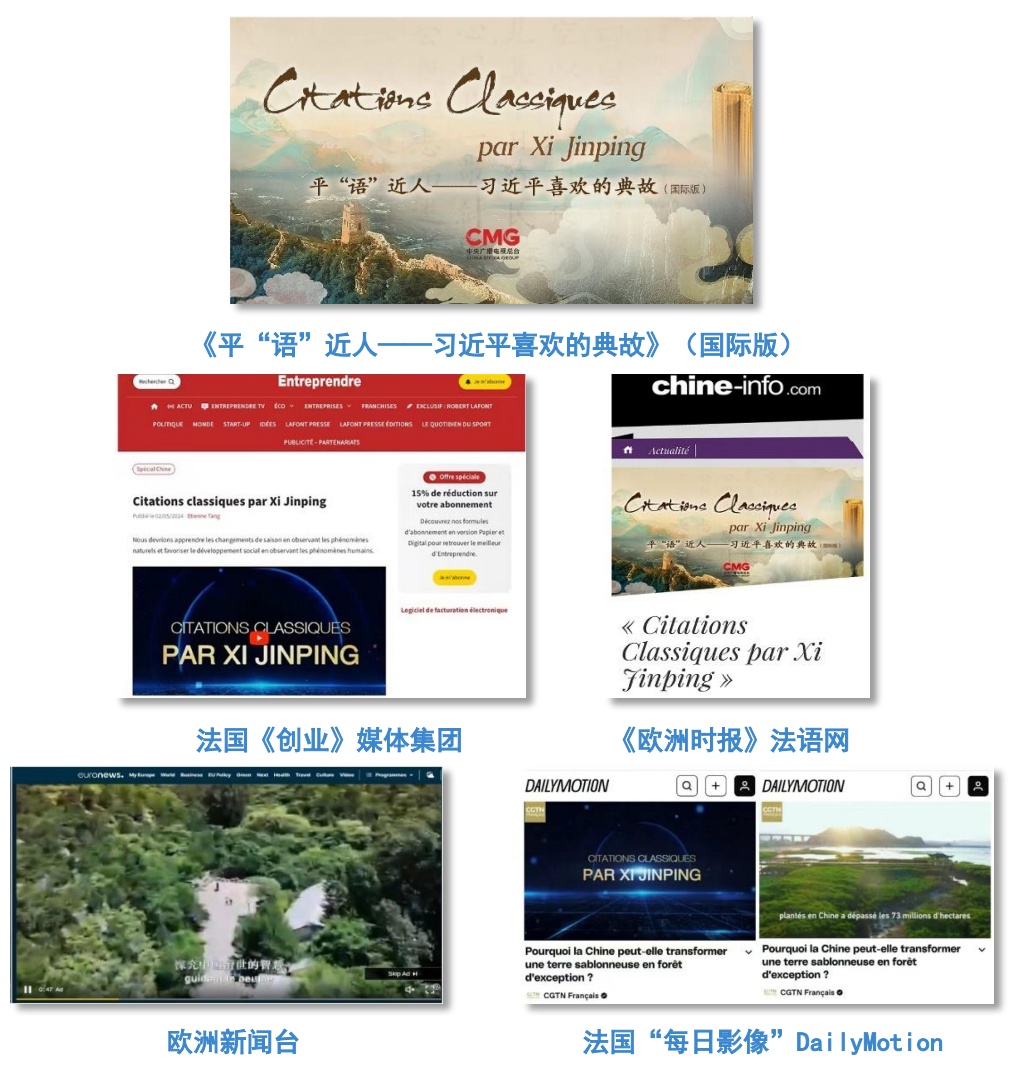 启播!在习近平主席对法国进行国事访问之际,总台制作的《平“语”近人——习近平喜欢的典故》(国际版)在法国“每日影像”DailyMotion、法国《创业》媒体集团等平台连续上线播出。节目及其宣传片等还在欧洲新闻台、法国BFM经济电视台等欧洲和全球近百家主流媒体陆续播发。