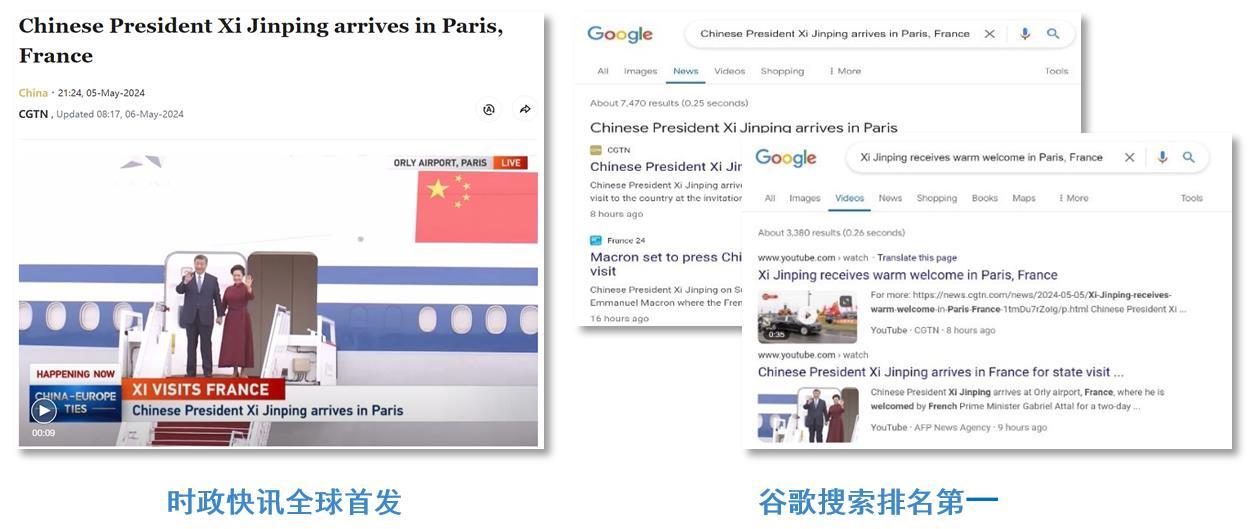 全球首发!CGTN新媒体、央视新闻新媒体同步首发《中国国家主席习近平抵达巴黎》《习近平同法国总统马克龙共见记者》等时政快讯,时效全程领先法新社、路透社等国际主流媒体。CGTN相关报道在谷歌搜索整体排名及新闻、视频、图片等分类排名中,均位列第一。
