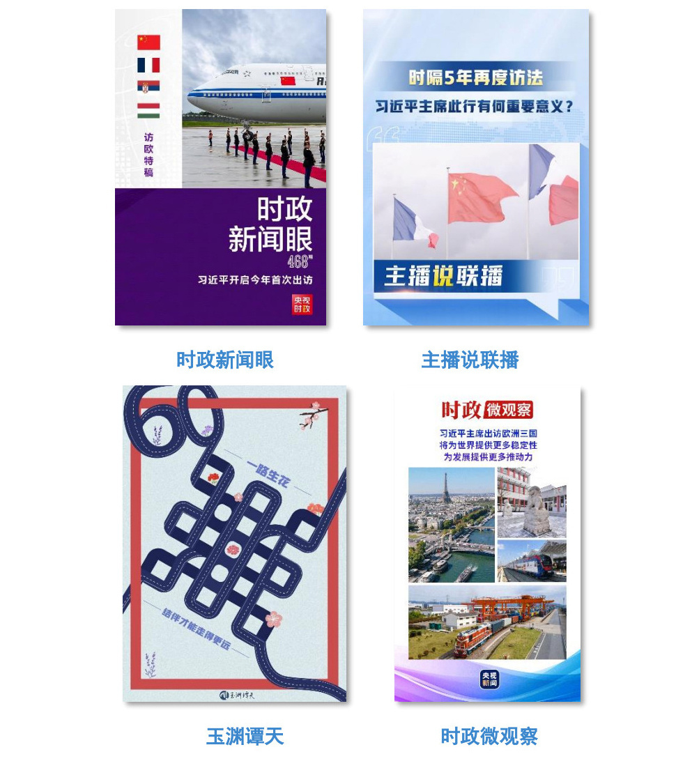 解读此访重要意义。总台言论评论矩阵“国际锐评”“时政新闻眼”“主播说联播”“玉渊谭天”“时政微观察”“联播+”等积极发声,持续推出《下一个60年,中法合作这样“继往开来”》《习近平开启今年首访,一次值得期待的历史性访问》《习近平主席法国之行开启,这三个信息值得关注》《习近平主席的巴黎时间,密集活动释放中法关系重磅信息》《从一个词来看,五年后的这个第一次》等解读文章,多角度阐释“用历史的火炬照亮前行的路,创造中法关系更加美好未来”,立体化解读中欧关系有着强大内生动力和广阔发展前景,将为世界提供更多稳定性、为发展提供更多推动力。