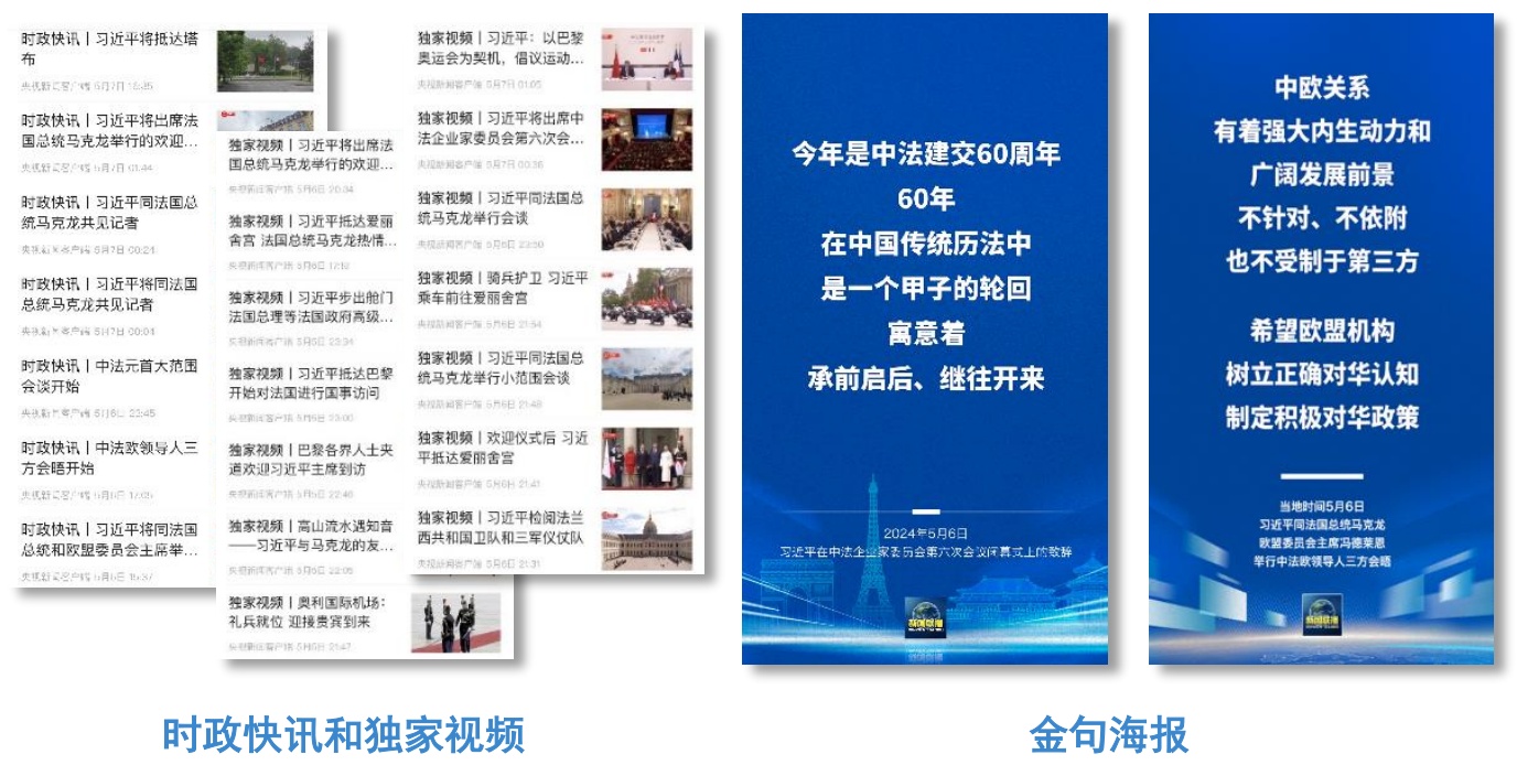 重要动态即时跟进。围绕中法两国元首会谈、中法欧领导人三方会晤等重要活动,央视新闻新媒体全网首发首推《习近平:中法两国友谊既是中法人民之福 也是世界人民之幸》《习近平:以巴黎奥运会为契机,倡议运动会期间全球停火止战》等52条时政快讯和独家视频,总阅读浏览量达13.5亿。《习近平:中欧关系不针对、不依附、也不受制于第三方》等海报产品,第一时间传播习主席重要讲话金句。