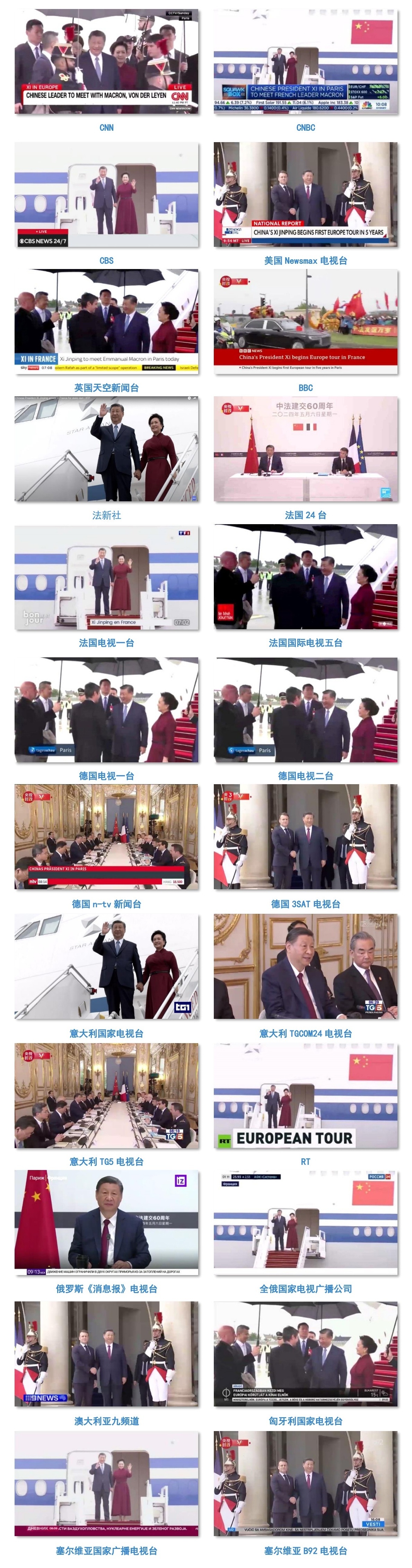 广泛覆盖!总台国际视频通讯社对外发布“习主席欧洲之行”相关新闻视频179条,被包括CNN、CNBC、CBS、BBC、法国24台、法国新闻台、法国国际电视五台、RT、全俄国家电视广播公司、德国之声、德国电视一台、意大利广播电视公司、塞尔维亚国家广播电视台、匈牙利国家电视台、葡萄牙国家广播电视台、日本NHK、新加坡亚洲新闻台、印度全印电视台、韩联社、澳大利亚广播公司等在内的87个国家和地区的497家电视台及新媒体平台采用播出6031次。其中,欧洲媒体平台数量占比40%,共有35个欧洲国家的199家电视台采用播出2520次。