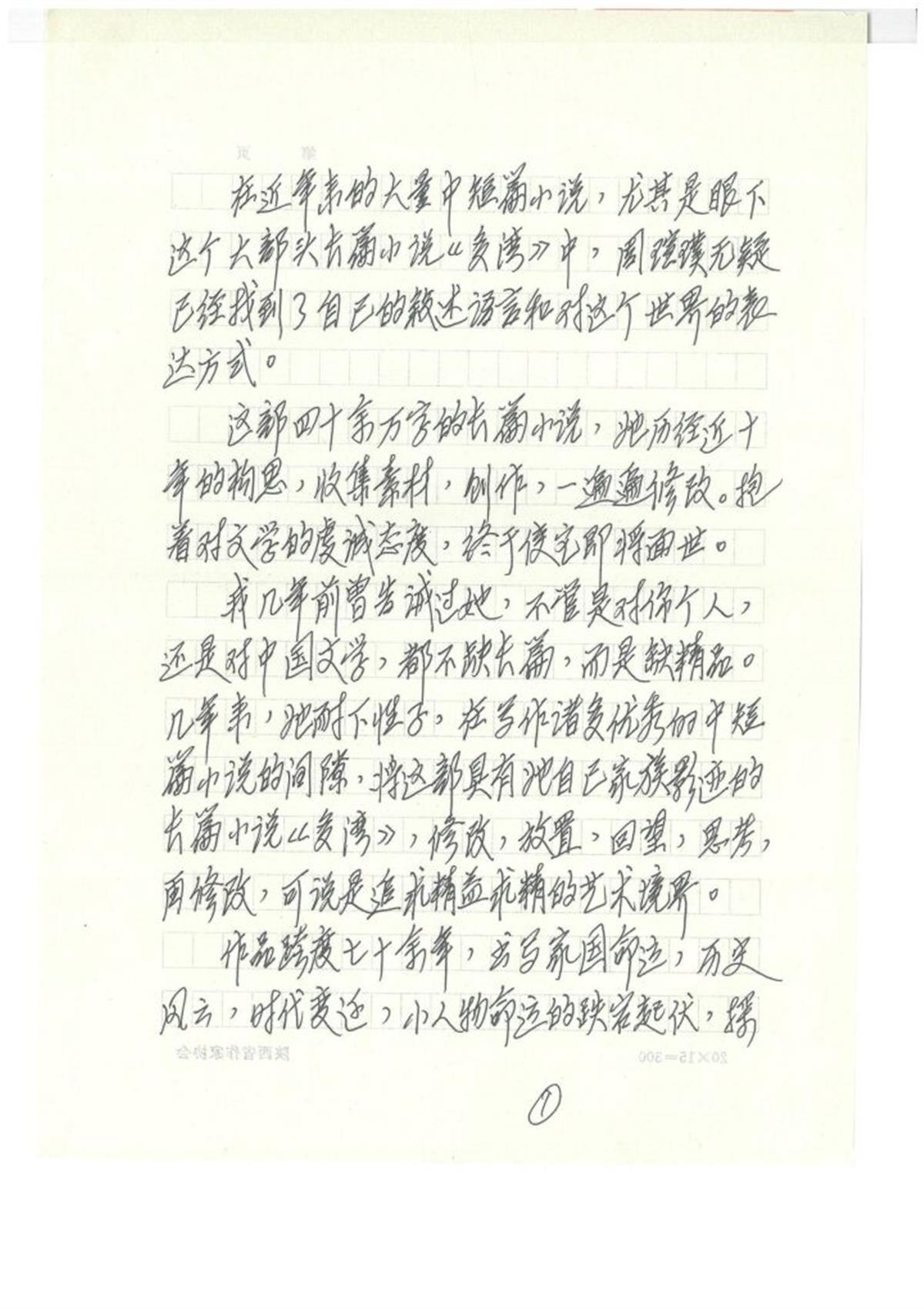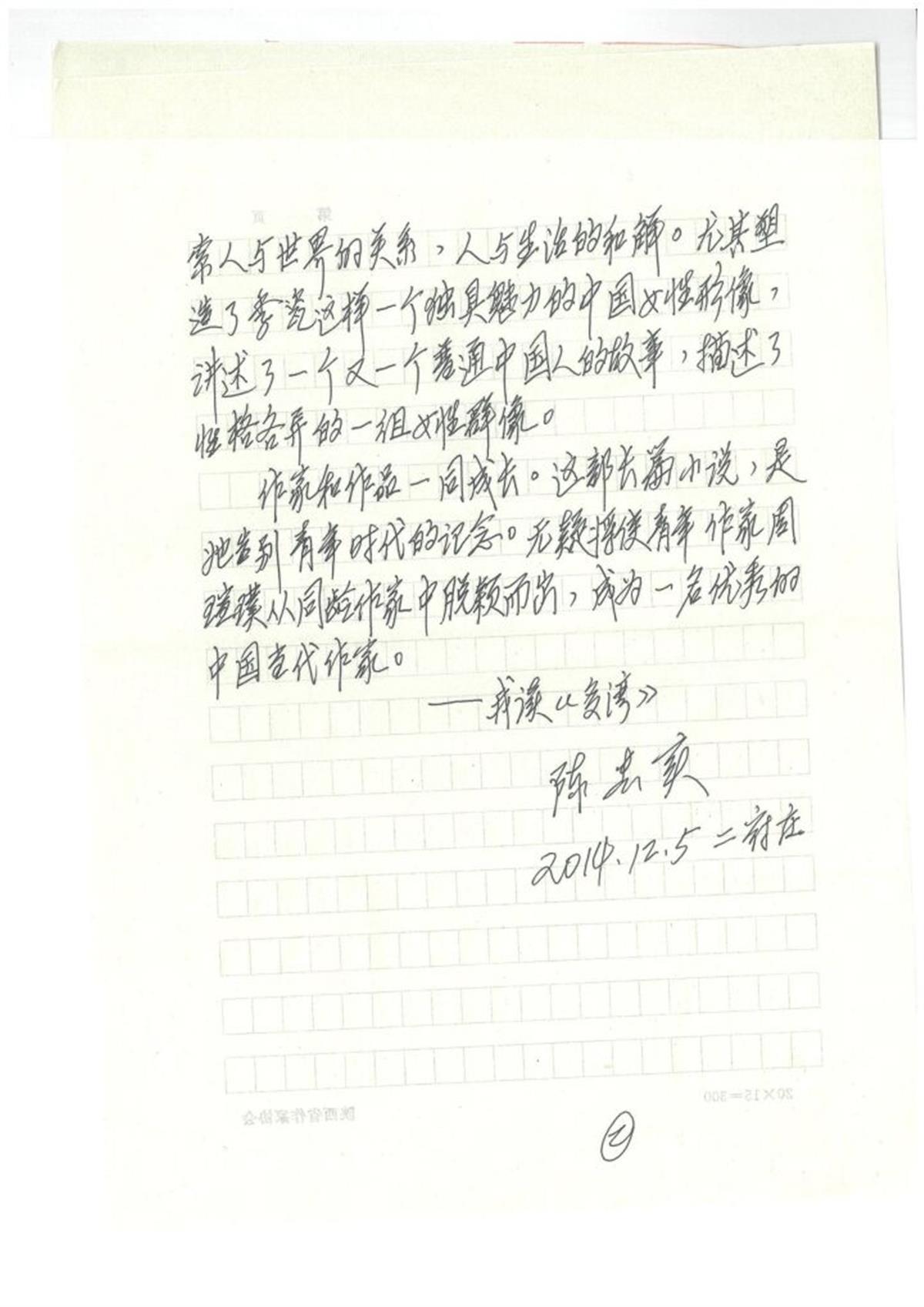 陈忠实生前还为《多湾》手写了推荐语。极目新闻记者在这份遗留下来的手迹中看到,陈忠实写道:“在近年来的大量中短篇小说,尤其是眼下这个大部头长篇小说《多湾》中,周瑄璞无疑已经找到了自己的叙述语言和对这个世界的表达方式……我几年前曾告诫过她,不管是对你个人,还是对中国文学,都不缺长篇,而是缺精品。几年来,她耐下性子,在写作诸多优秀的中短篇小说的间隙,将这部具有她自己家族影迹的长篇小说《多湾》,修改,放置,回望,思考,再修改,可说是追求精益求精的艺术境界,作品跨度七十余年,书写家国命运,历史风云,时代变迁,小人物命运的跌宕起伏,探常人与世界的关系,人与生活的和解……”