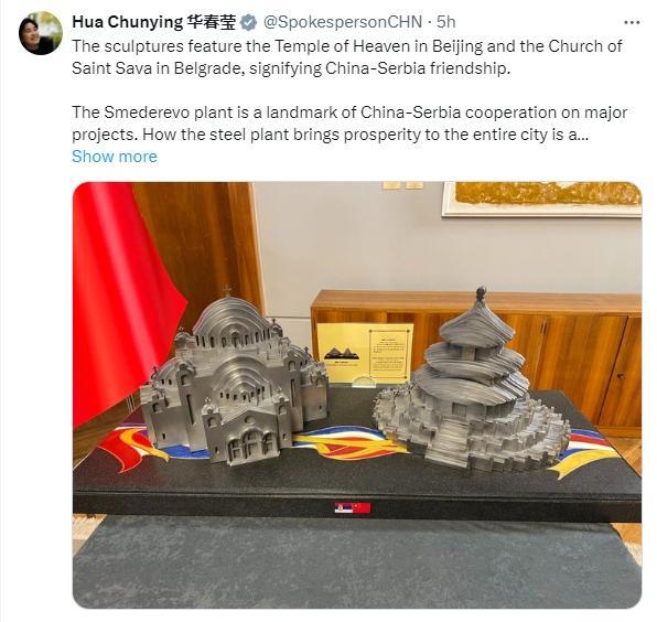 “斯梅戴雷沃钢厂是中塞重大项目合作的标志性建筑。钢厂如何给整个城市带来繁荣,是两国人民津津乐道的故事。”华春莹写道。