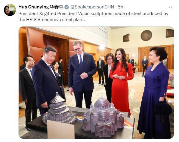 中新网5月9日电 5月7日至8日,中国国家主席习近平对塞尔维亚进行国事访问。5月9日,中国外交部发言人华春莹在社交平台上发帖透露,习近平主席将河钢集团斯梅戴雷沃钢厂生产的钢铁雕塑赠送给武契奇总统。