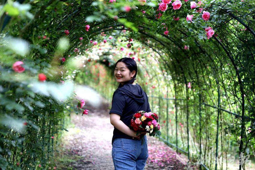 吃完烧烤后的游客们又来到月季长廊欣赏月季花并拍照打卡。他们竞相拍照,享受那份悠闲。因月季要经常修剪花枝才能开得更好,花园的主人王庆华还会将修剪下来的月季花束送给游客。