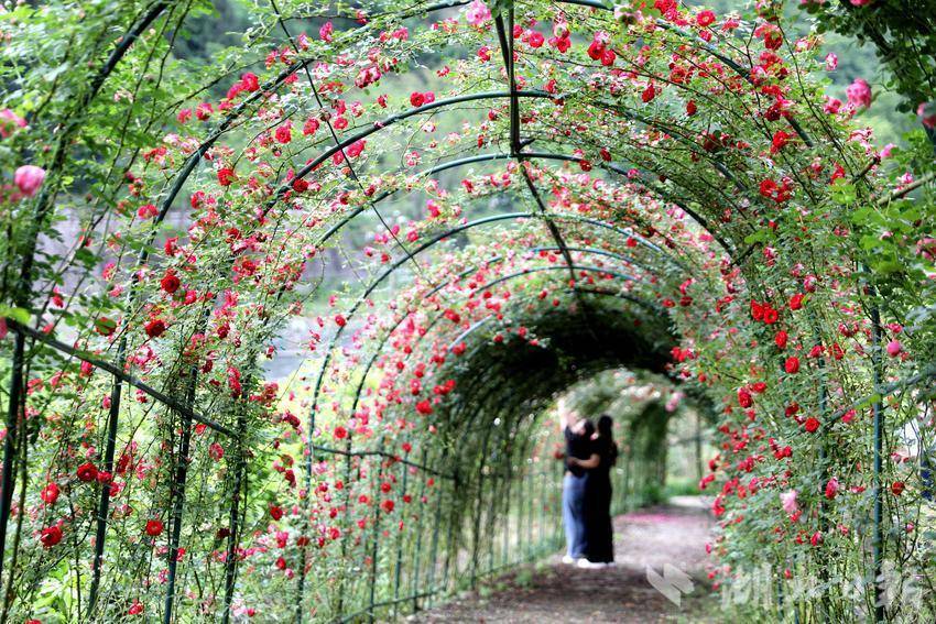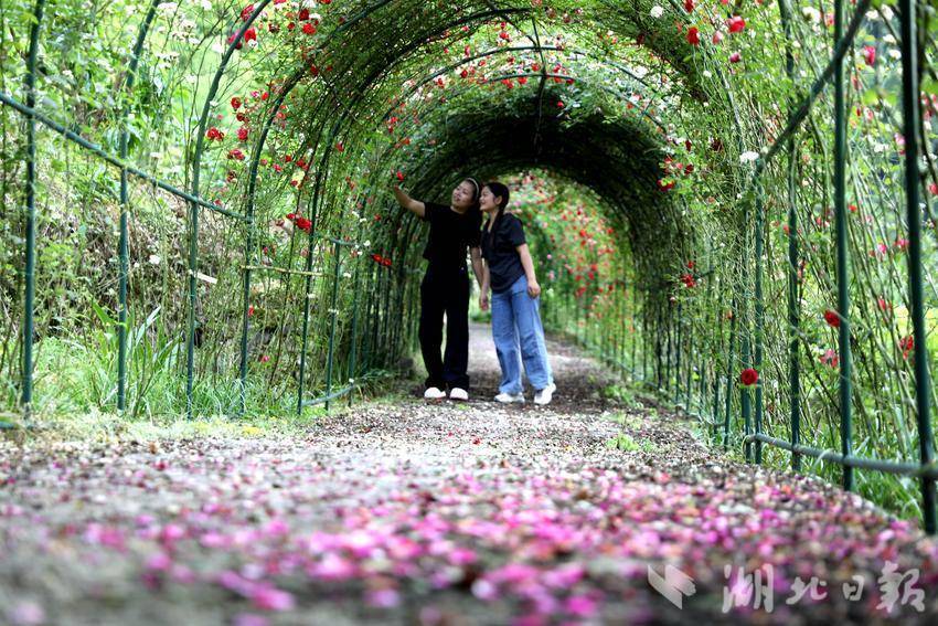 湖北日报客户端讯(通讯员陈玉玲)近日,鹤峰县下坪乡堰坪村山水欢乐谷里,月季长廊的月季花进入盛花期,艳红、玫红、粉红、粉黄等各色月季花盛开,让夏日浪漫气氛拉满。