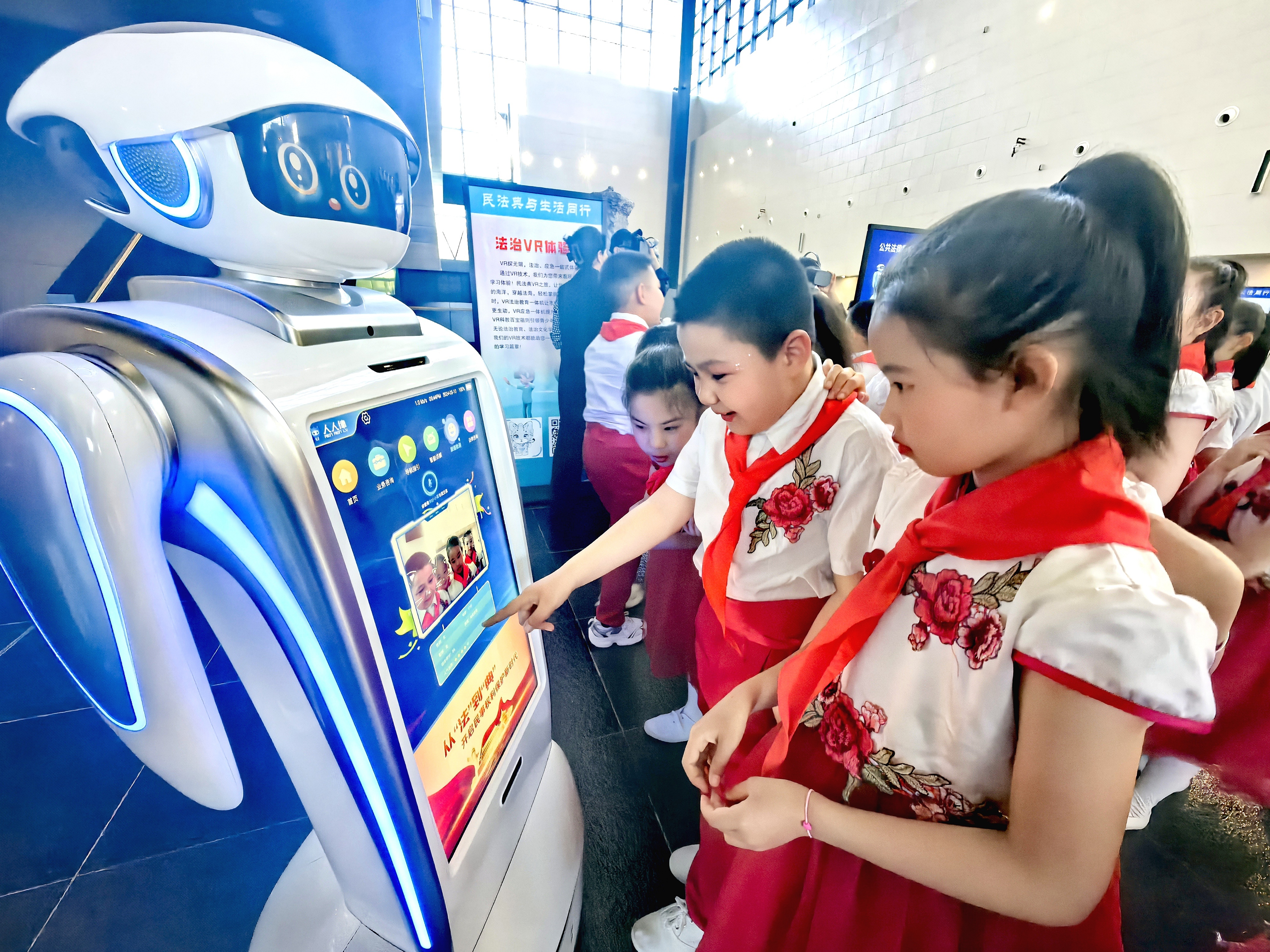 5月10日下午,新疆维吾尔自治区“优化营商环境·法治进民企”民法典主题宣传活动启动仪式在乌鲁木齐举行。在活动现场的法治互动体验区,参加活动的同学们正在和公共法律服务智能机器人“对话”,进行趣味学法。法治日报全媒体记者 潘从武 摄