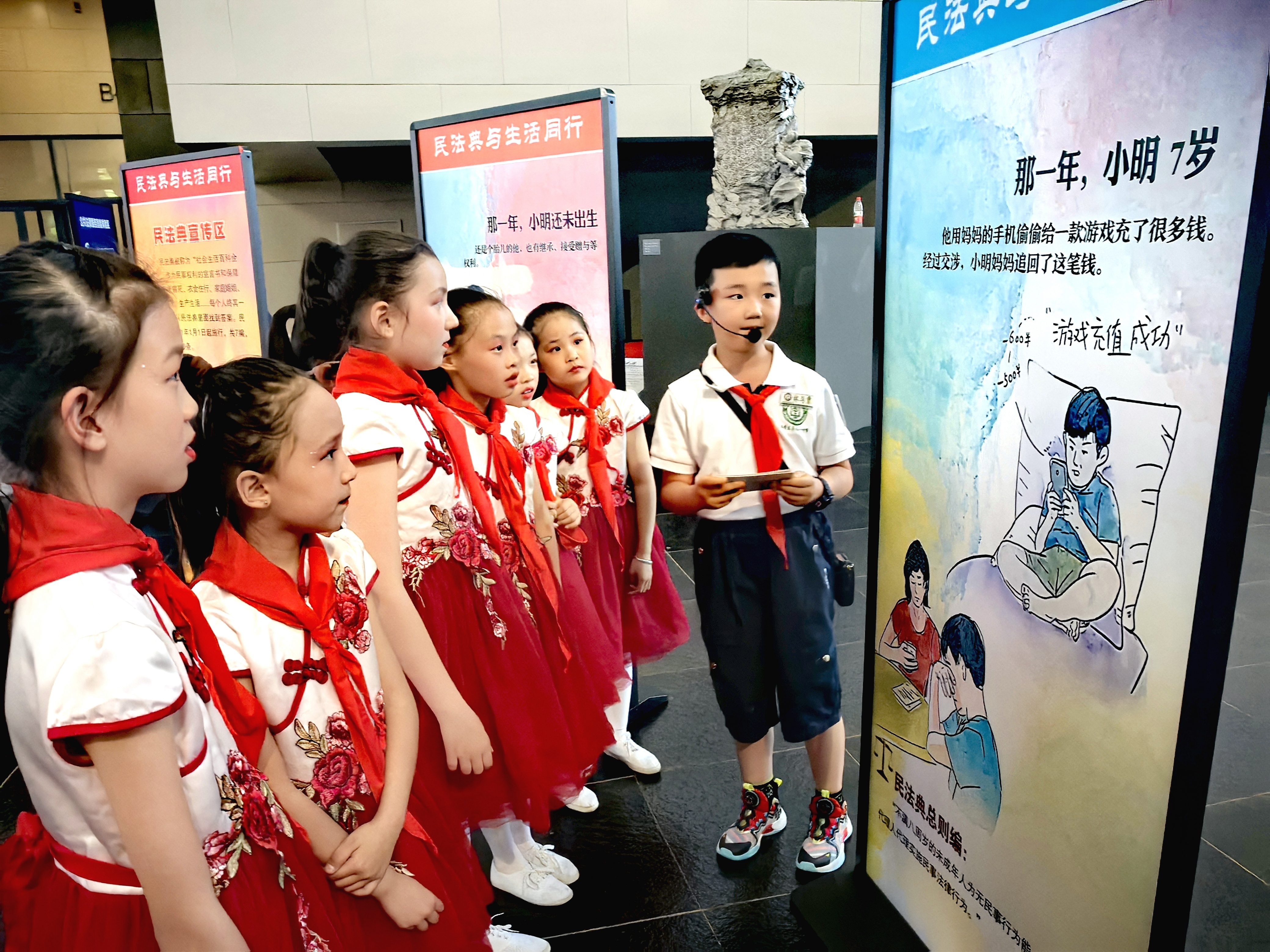 5月10日下午,新疆维吾尔自治区“优化营商环境·法治进民企”民法典主题宣传活动启动仪式在乌鲁木齐举行。在活动现场的法治互动体验区,小小“法治宣传员”正在向参加活动的同学们讲解《中华人民共和国民法典》知识。法治日报全媒体记者 潘从武 摄