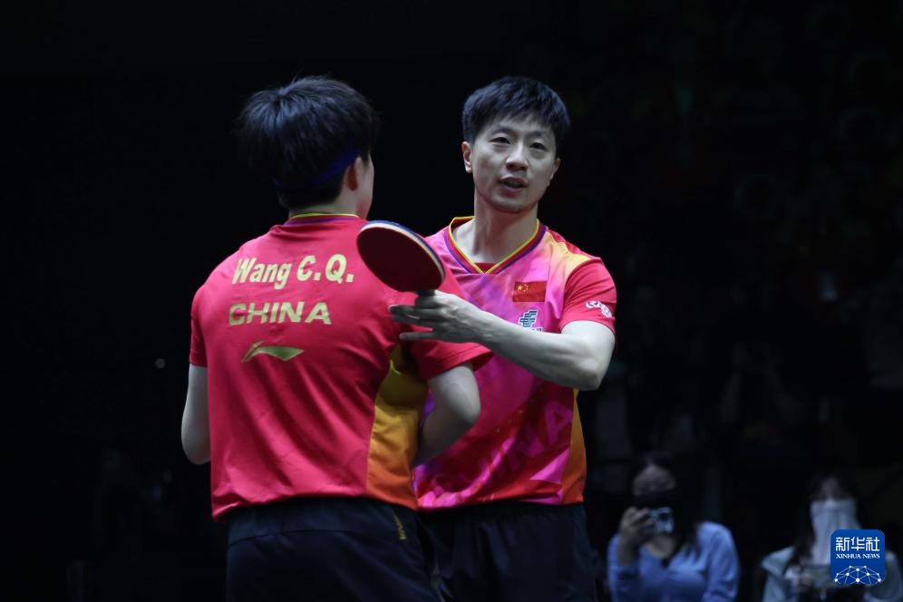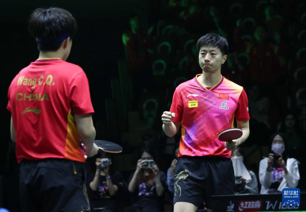 5月10日,马龙(右)/王楚钦在比赛中。新华社记者 王海洲 摄