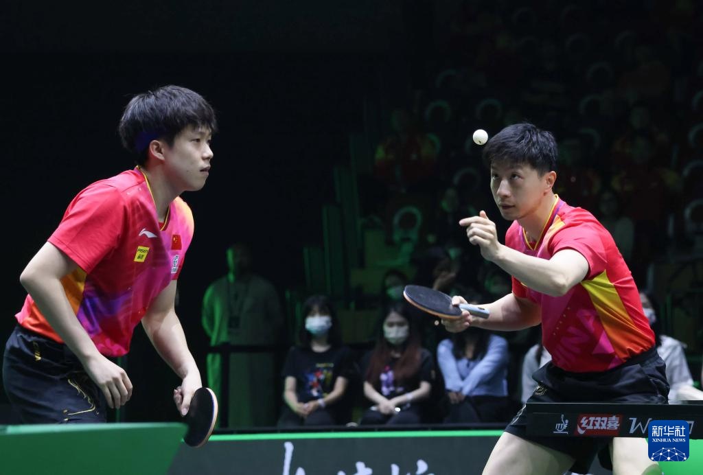 5月10日,马龙/王楚钦(左)在比赛中。新华社记者 王海洲 摄