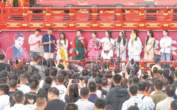 5月11日下午,武汉市黄陂区姚家集街杜堂村木兰不夜城景区热闹非凡。原来,火爆网络的河南开封万岁山·大宋武侠城景区相亲栏目“王婆说媒”主持人赵梅,受邀来此主持“干娘茶馆”大型交友活动,吸引了众多单身男女参加。据了解,该活动于5月11日至14日每天下午5时举行。楚天都市报极目新闻记者黄士峰摄