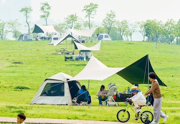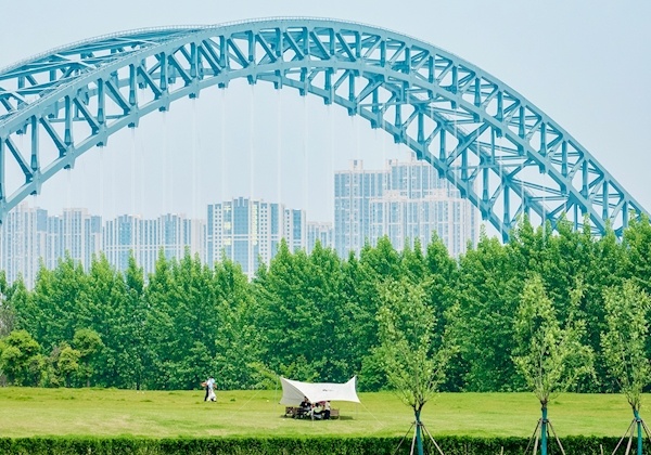 每逢节假,汉阳区汉水公园,知音湖畔,汉江湾桥如同一只巨大的臂膀,将顶顶白色帐篷和天幕拥入“怀抱”。浓密的树荫下,人们或在帐篷里或在天幕下享受假日的闲适时光。