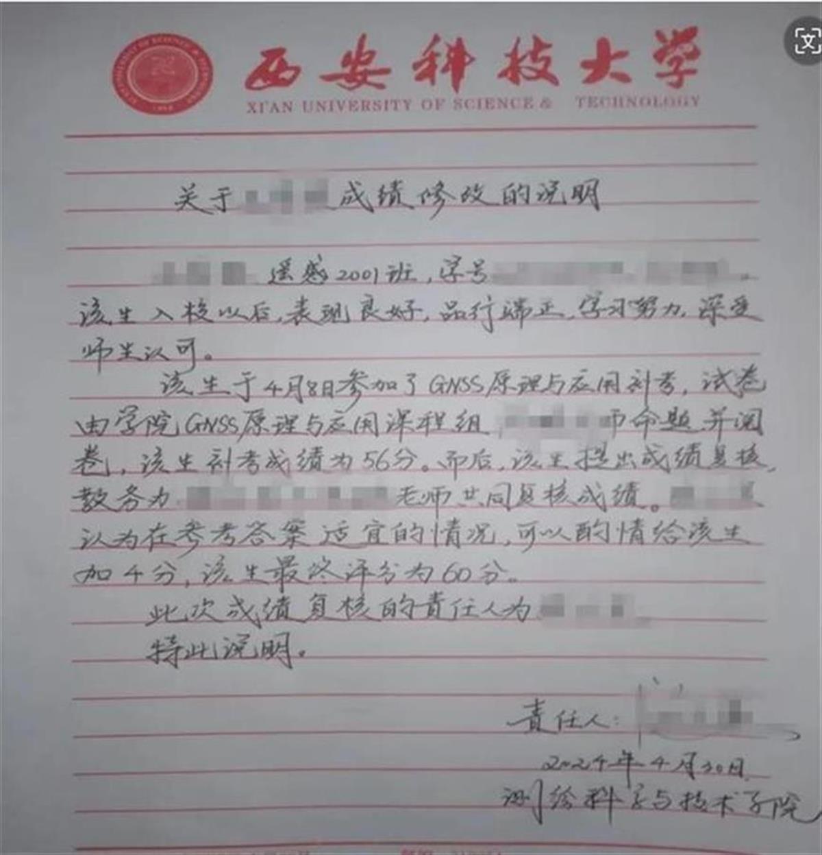 近日,西安大学一名副教授、硕士生导师向媒体爆料称,他因拒绝为挂科的陈姓学生修改成绩遭家长威胁,学院施压。后来学院在该门课程补考时,绕过他这个专任教师,更换出题人、阅卷人,该陈姓学生通过了补考,但另有一名王姓学生未通过,经学院工作人员张某某出具手写成绩修改说明,最终将该名王姓学生补考成绩从56分“酌情”增加至60分。