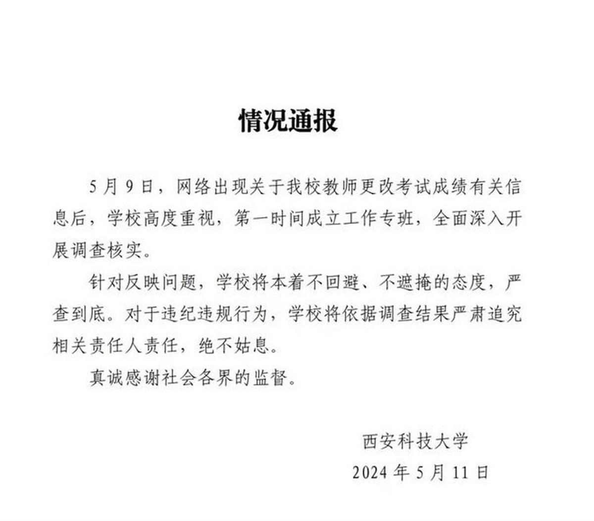 近日,西安科技大学改成绩事件引发广泛关注。5月11日,西安科技大学官网发布情况通报称,该校高度重视此事,第一时间成立工作专班,全面深入开展调查核实。