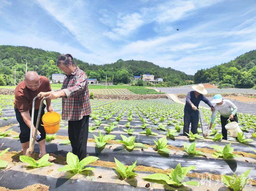 “要趁着烟苗还未搭桥的时节,把地膜撕开10厘米的口子,然后把肥料倒入,这样才会让雨水进入实现水肥一体化,更好地吸收营养……”另一边,在该镇南潭烟农陈千敏的烟田里,镇烟叶收购站技术人员正在烟田指导烟农科学培土、除草、施肥,严格把控烟叶生产的每个环节。