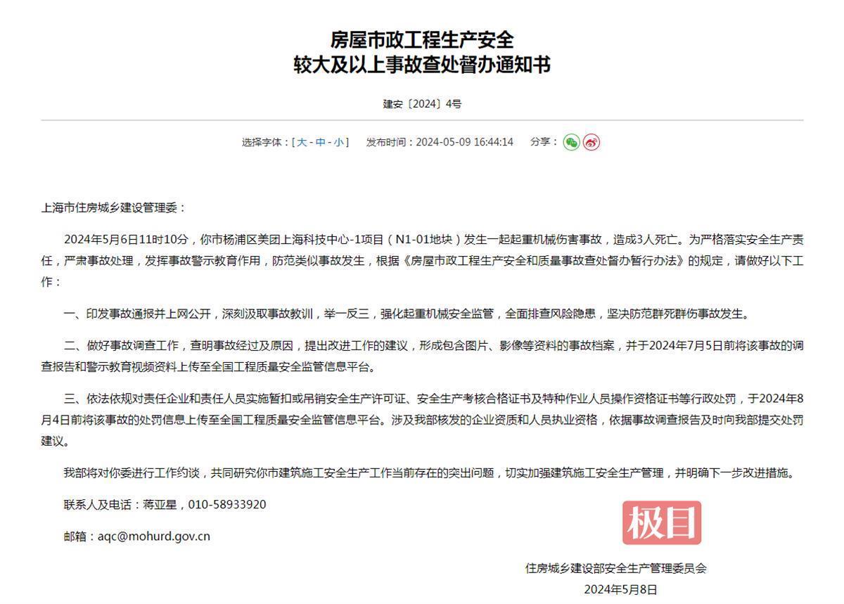 5月6日上午,上海市杨浦区大桥街道一个建筑工地发生一起起重机械伤害事故,致3人死亡。5月9日,住房城乡建设部安全生产管理委员会在住建部官网公开向上海市住房城乡建设管理委发布《房屋市政工程生产安全较大及以上事故查处督办通知书》,并提出三点工作要求。