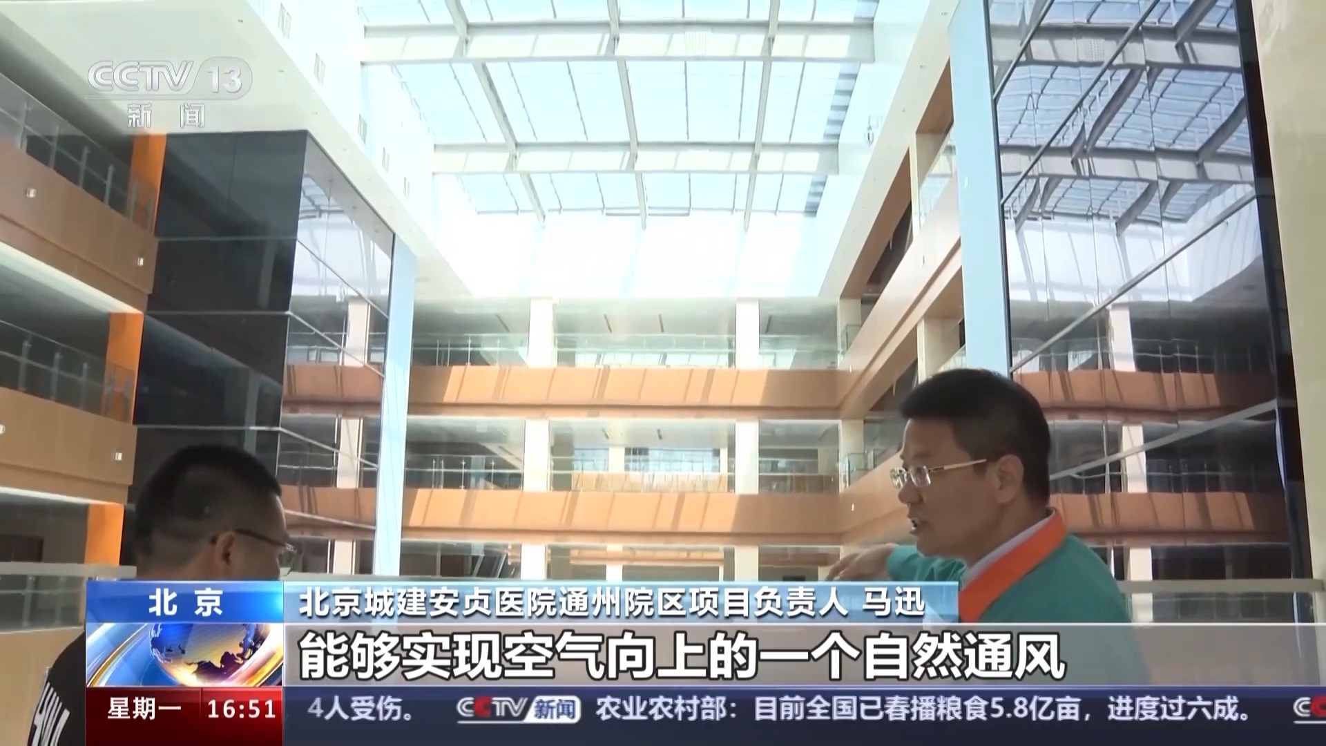 北京城建安贞医院通州院区项目负责人 马迅:我们的侧壁也开了一些侧窗,能够实现空气向上的自然通风、自然排放,对于空气洁净的循环是非常有好处的。