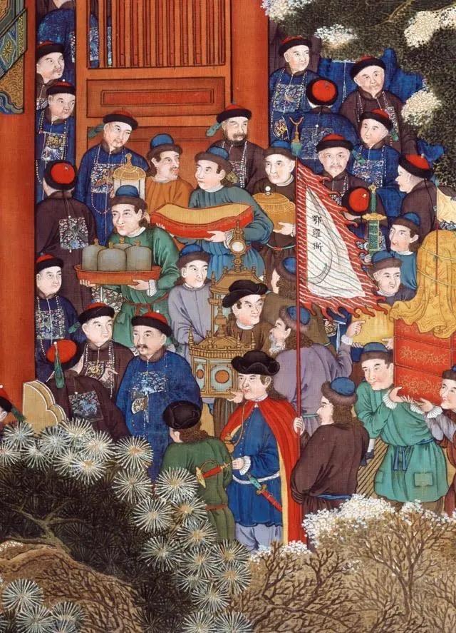 △ 清 佚名 《万国来朝图》局部,1778年,故宫博物院藏。其中就有一位外国使臣手里捧着一座将要进献的时钟。