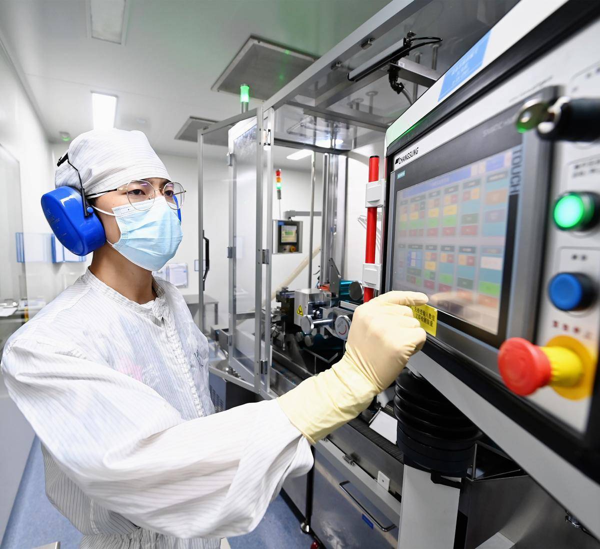 人福普克药业(武汉)有限公司无菌生产车间内,工人正在操作制药。