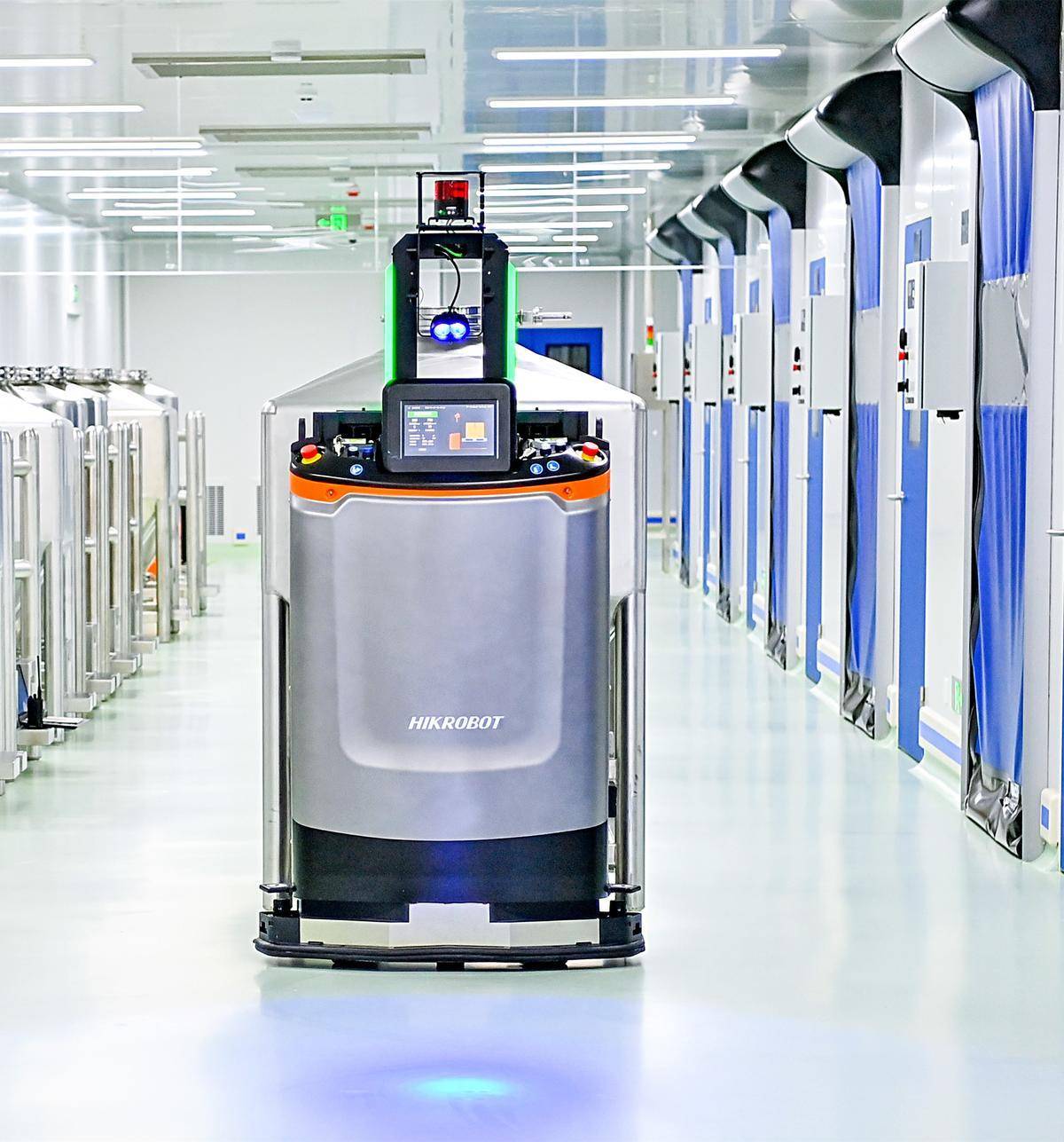 1月9日,在武汉光谷禾元生物植物源重组人血清白蛋白智能化工厂原液车间里,机器人正在忙碌着运送原液。(湖北日报全媒记者 朱熙勇 摄)