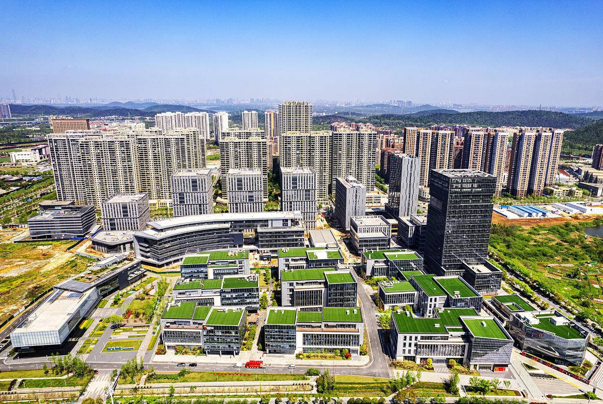 4月9日,鸟瞰武汉光谷生物城生物创新园,目前一期(Ⅰ期)项目已投用,二期(Ⅱ期)项目进入园林景观施工阶段,即将建成。(湖北日报全媒记者 朱熙勇 摄)